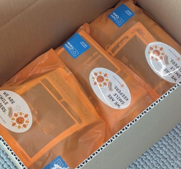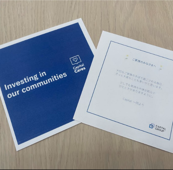 なお、今回制作いただいた100個のパックには、キャピタル・グループ様オリジナルのエコバッグと素敵なメッセージカードも同梱いただきました。パッケージはキャピタル・グループ様とキープ・スマイリング両社のシールを貼ったコラボパックとなっています。