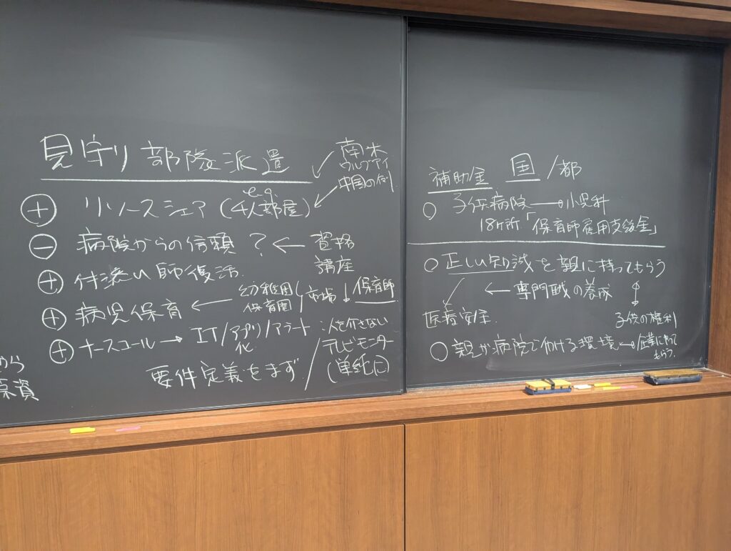 今回取り上げたのは「付き添う親が子どもから目が離せず、十分に休息できない」という課題。子どもにとっての安心と医療安全を両立させるために、どのような見守り支援が考えられるのか、当団体の視点から問題提起を行いました。