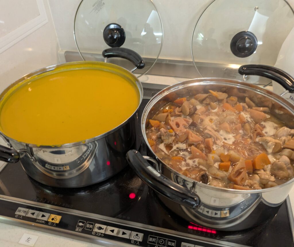当団体の管理栄養士が監修し、秋の気配が感じられるような旬の食材を取り入れました。ピーマンの肉詰めに、れんこんやごぼうなどのお野菜たっぷりの筑前煮、箸休めにピッタリな甘酢漬けなど、彩り豊かな野菜をふんだんに使い、家庭料理の温かさを感じられるメニューに仕上げました。また、ハロウィンの季節に合わせて、かぼちゃのポタージュも〜。