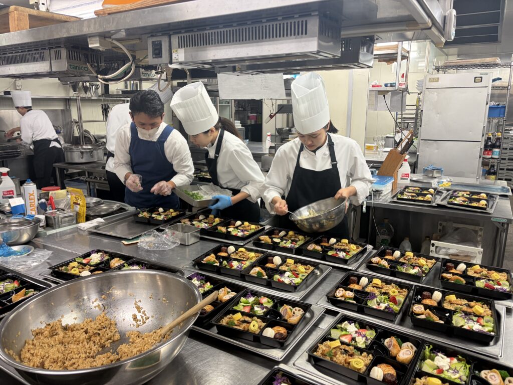 今月は、アクアデヴュー佐賀スィートテラス様のご協力いただき、見た目にも華やかなお弁当をお作りいただきました。