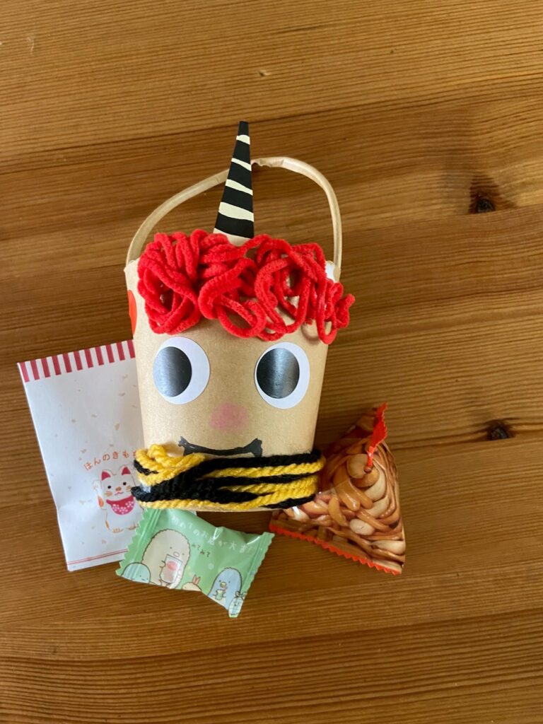 また、来月の節分を前に、鬼をモチーフにした入れ物にお菓子を詰めた佐賀スタッフ特製ギフトもお届けしました。