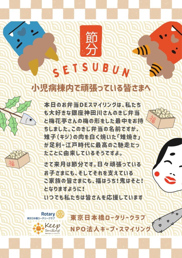 昨年に引き続き、東京日本橋ロータリークラブ様の温かいご支援により、病院に付き添うご家族の皆さまへお弁当をお届けしました。