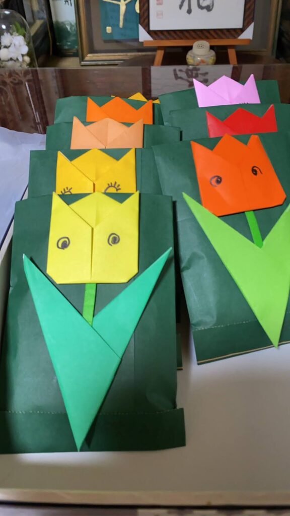 佐賀支部からは、応援の気持ちを込めて、折り紙で作ったチューリップにお菓子を添えたプレゼントをお届けしました。