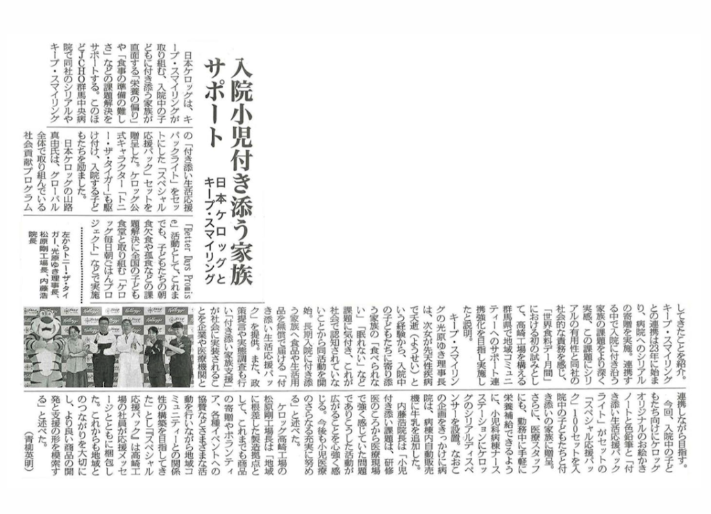 2025年10月6日、キープ・スマイリングは日本ケロッグ合同会社様と連携し、JCHO群馬中央病院にて、入院中の子どもたちと付き添いのご家族に「スペシャル応援パック」贈呈式を実施。その様子が10月29日「日本食糧新聞」に掲載されました。