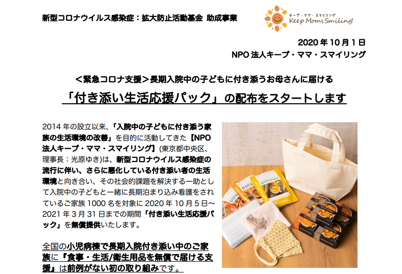 【プレスリリース】<緊急コロナ支援>長期入院中の子どもに付き添うお母さんに届ける「付き添い生活応援パック」の配布をスタートします