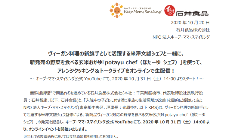 無添加調理で商品作りを進めている石井食品株式会社(本社:千葉県船橋市、代表取締役社長執行役員:石井智康、以下、石井食品)と、「入院中の子どもに付き添う家族の生活環境の改善」を目的に活動してきたNPO 法人キープ・ママ・スマイリング(東京都中央区、理事長:光原ゆき、以下 KMS)は、ヴィーガン料理の新旗手として活躍する米澤文雄シェフ監修による、新商品ヴィーガン対応の野菜を食べる玄米おかゆ「potayu chef(ぽたーゆシェフ)」の発売を記念し、キープ・ママ・スマイリング公式 YouTube にて、2020 年 10 月 31 日(土)14:00 より、オンラインイベントを開催いたします。