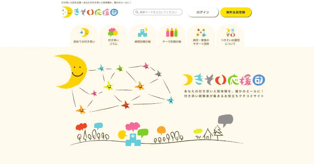 NPO法人キープ・ママ・スマイリング(東京都中央区、理事長:光原ゆき、以下KMS)は、子どもの入院に付き添った経験を持つ家族同士が支え合うための日本初のクチコミサイト「つきそい応援団( https://tsukisoi.jp )」を9月30日にオープンしました。同サイトは、付き添い経験者が自身の体験や工夫を書き込める掲示板機能のほか、付き添い生活の必需品リストなど付き添い入院に役立つさまざまな生活情報を掲載しています。本サイトを通じて、コロナ禍で孤立を深める付き添い家族が、初めての入院でも安心して病気の子どもの看病に専念できる環境づくりをサポートしていきます。