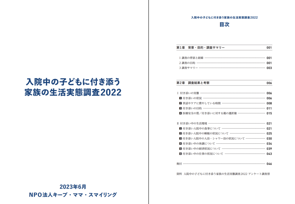 NPO法人キープ・ママ・スマイリング(東京都中央区、理事長:光原ゆき)は、「入院中の子どもに付き添う家族の生活実態調査2022」の調査概要を6月1日(木)に公表しました。