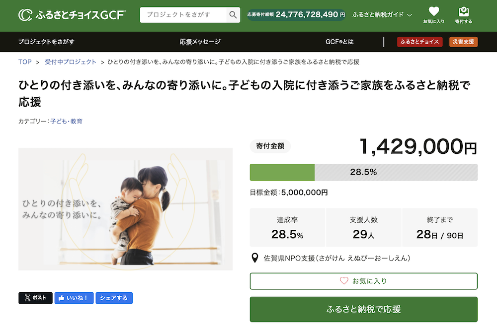「付き添い生活応援パック」を必要とする付き添い中のご家族はまだ全国にいらっしゃいます。ふるさと納税の寄付金は、入院中のお子さんに付き添うご家族をサポートする活動に大切に活用させていただきます。