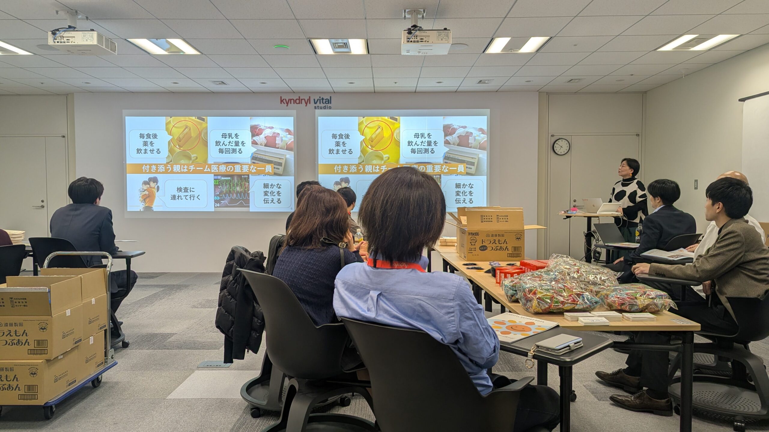 当日は、まず当団体の活動趣旨や付き添い家族を取り巻く現状について、理事長・光原ゆきよりお話しした後、総勢24名ほどの皆さまと一緒に準備スタート。4チームに分かれてお菓子やメッセージカードを一つひとつ丁寧に封入し 、心を込めて12病院分のギフトを制作していただきました。